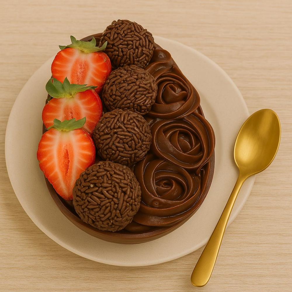Casca de chocolate blend recheada com brigadeiro gourmet cremoso intercalado com calda de morango.