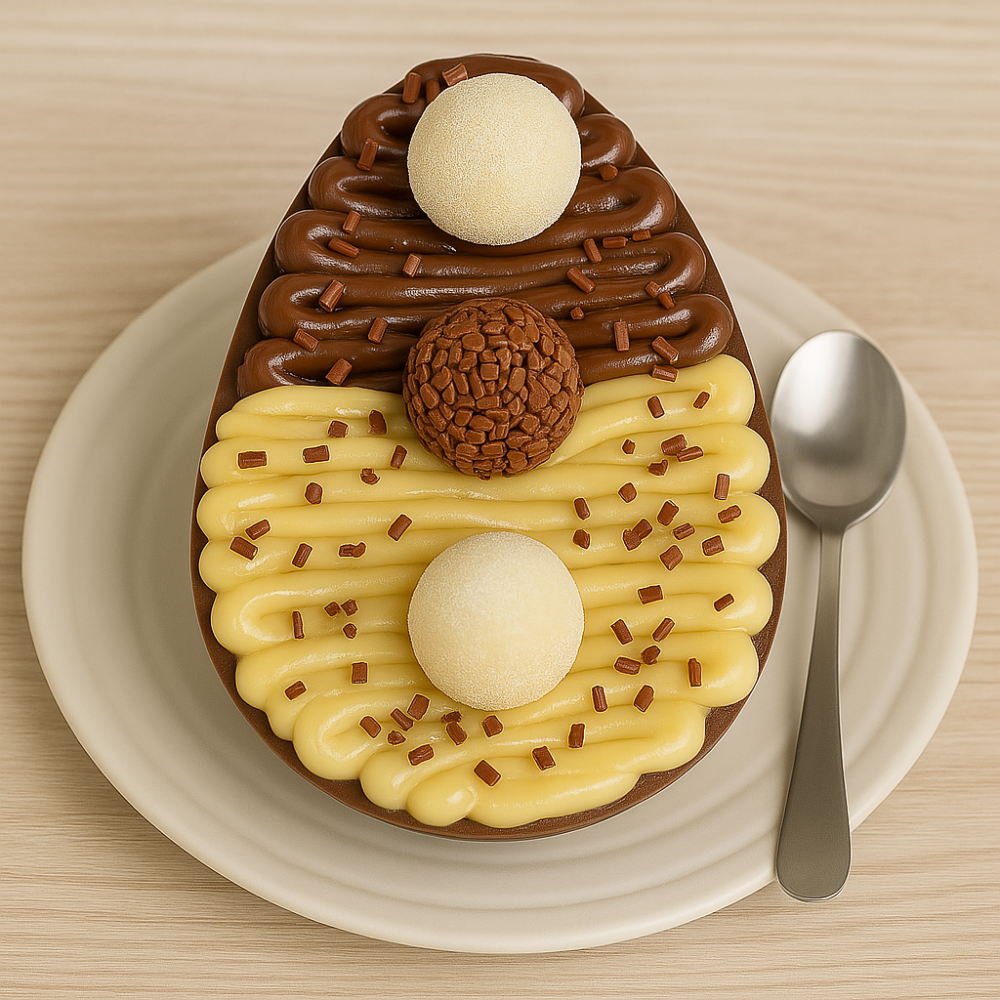 Ovo de chocolate ao leite recheado com brigadeiro cremoso ao leite e creme de leite Ninho gourmet.