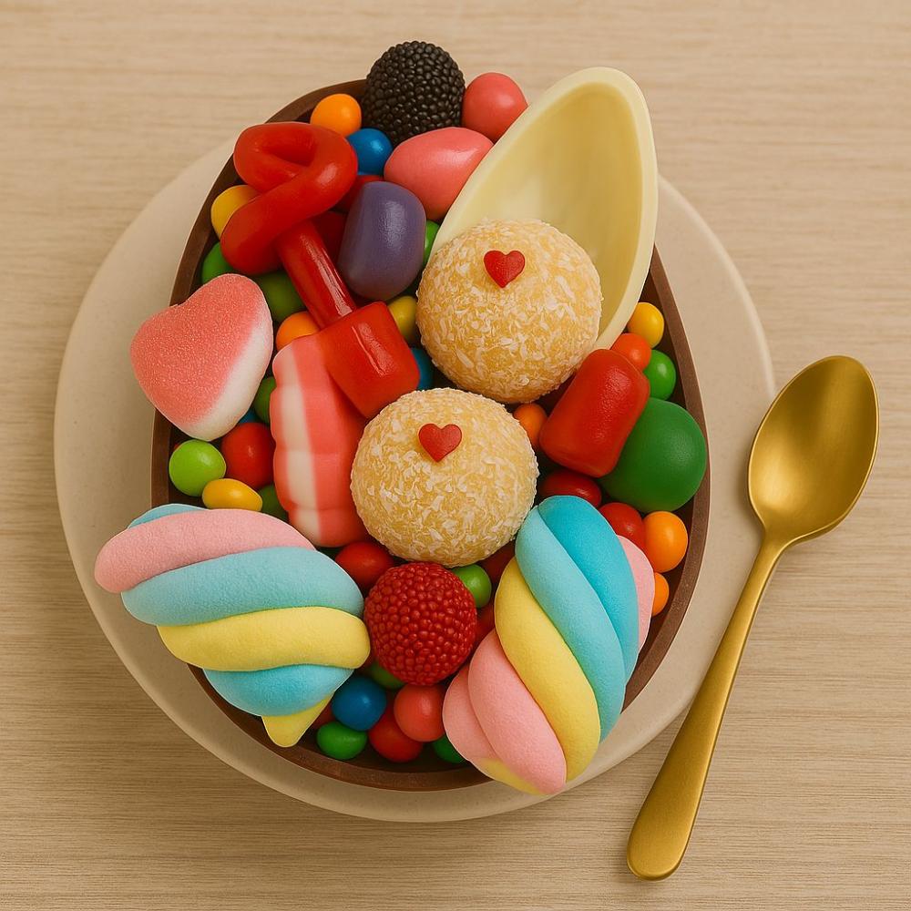 Ovo de colher com casca blend, recheado com brigadeiro ao leite, decorado com uma divertida seleção de guloseimas coloridas, perfeito para os pequenos (e os grandinhos também) se deliciarem com muito sabor e diversão!